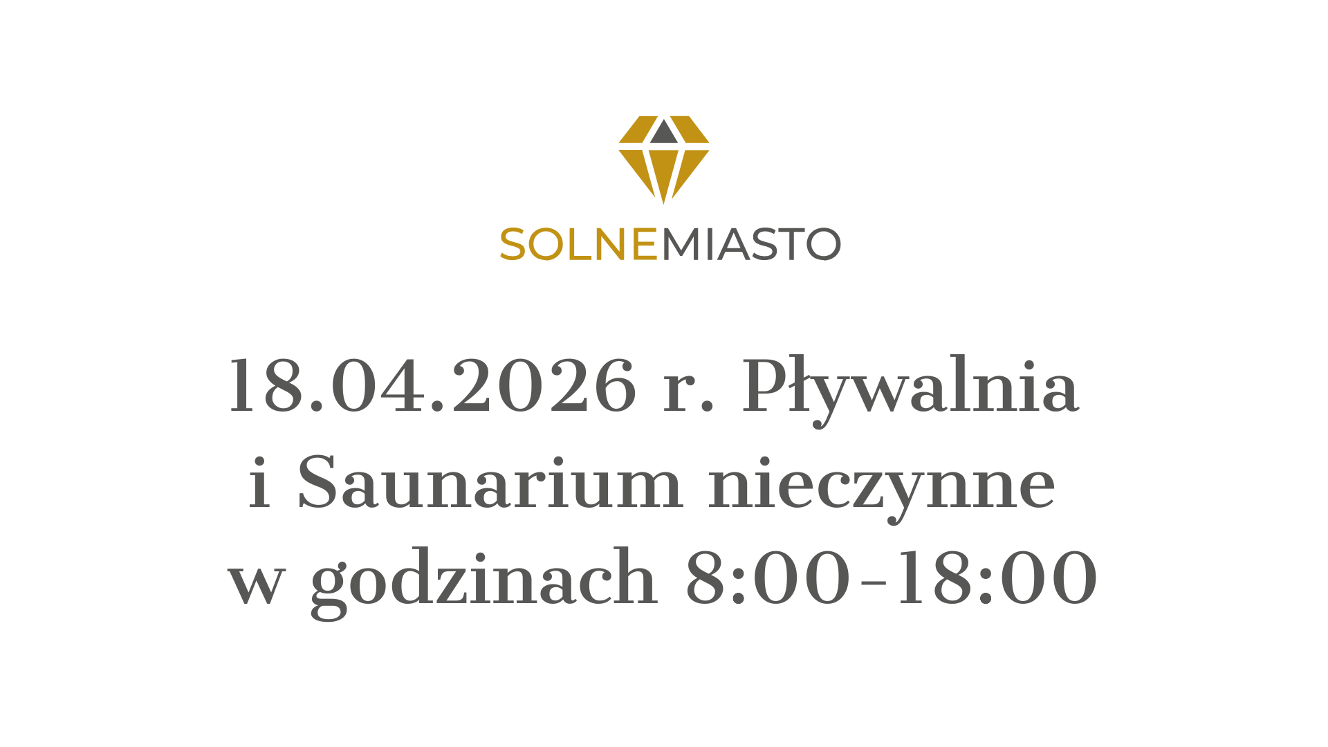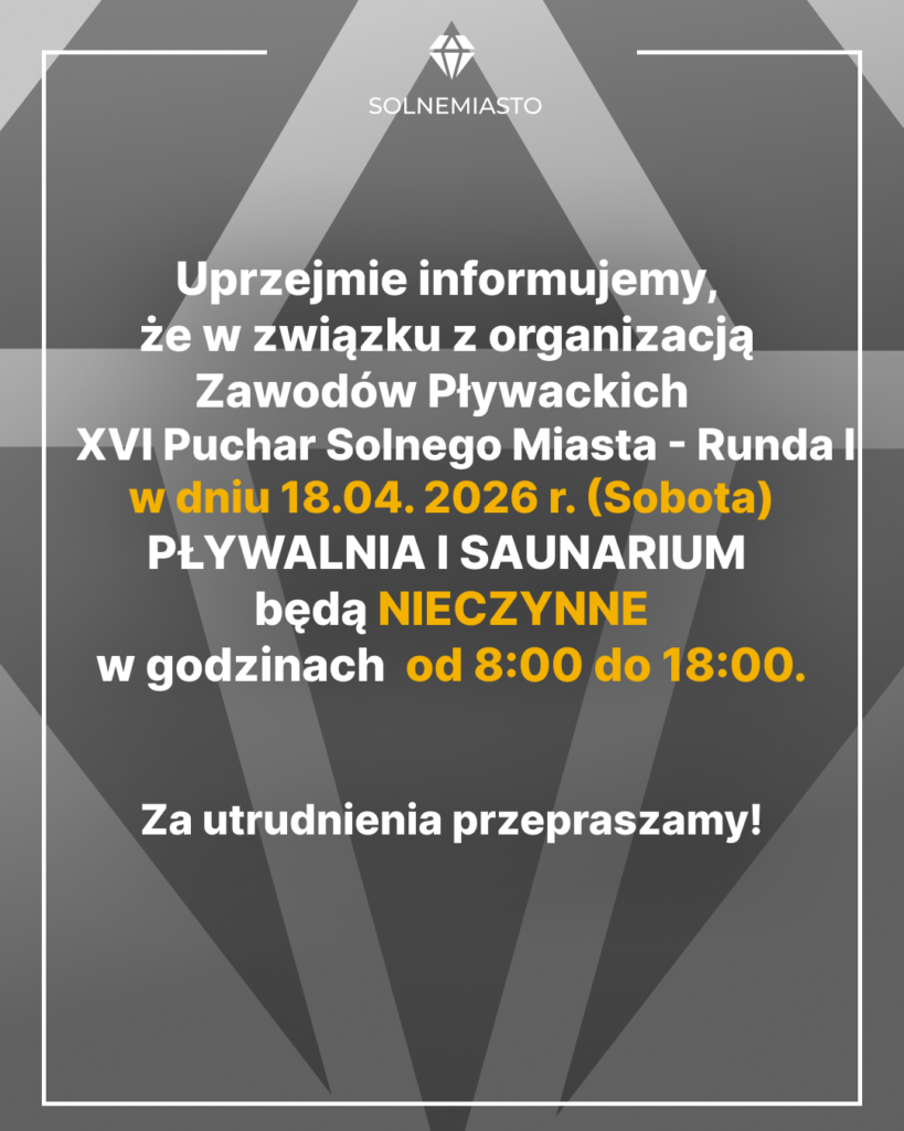uprzejmie informujemy, że w dniu 18.04. 2026r. na naszej pływalni odbywać się będą Zawody Pływackie XVI Puchar Solnego Miasta. W związku z powyższym, w tym dniu nasza pływalnia i saunarium będą nieczynne w godzinach 8:00-18:00.