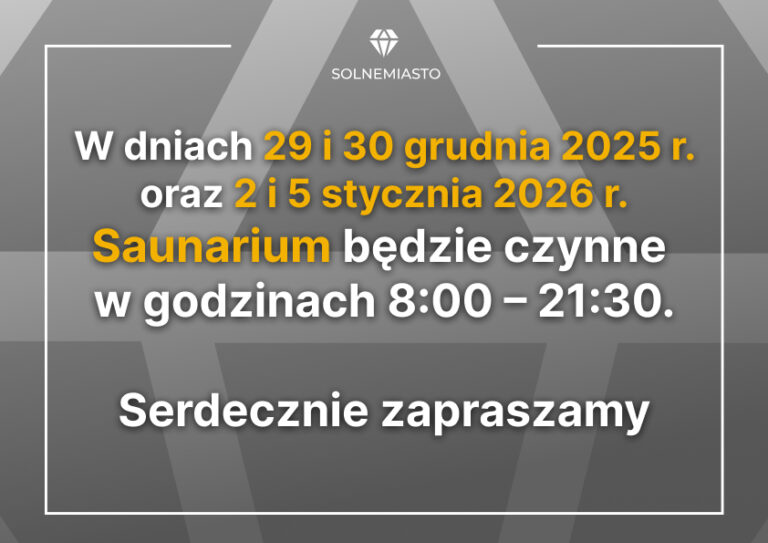 29 i 30 grudnia 2025 r.oraz 2 i 5 stycznia 2026 r. Saunarium działa od godziny 8:00 do 21:30