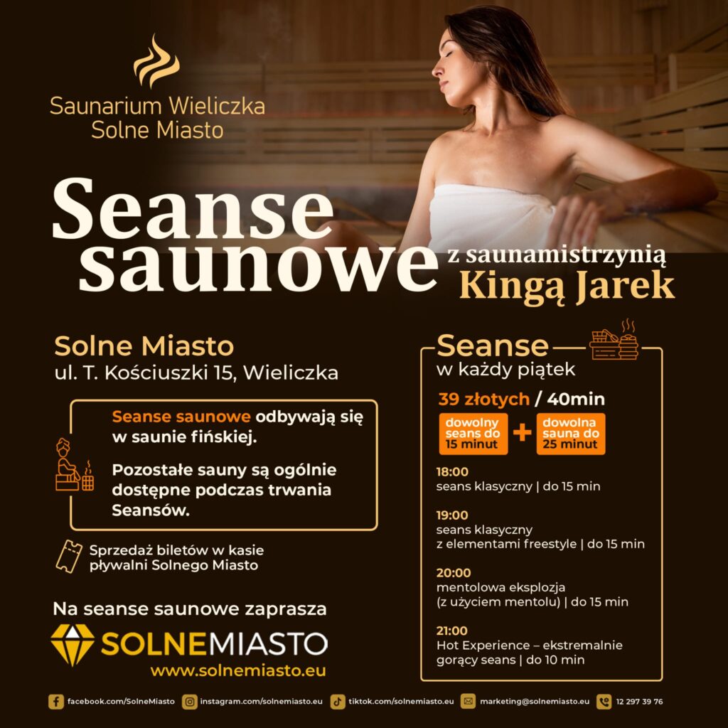 Regularny cykl seansów saunowych z saunamistrzynią Kingą Jarek trwa w KAŻDY PIĄTEK w Solne Miasto w Wieliczce