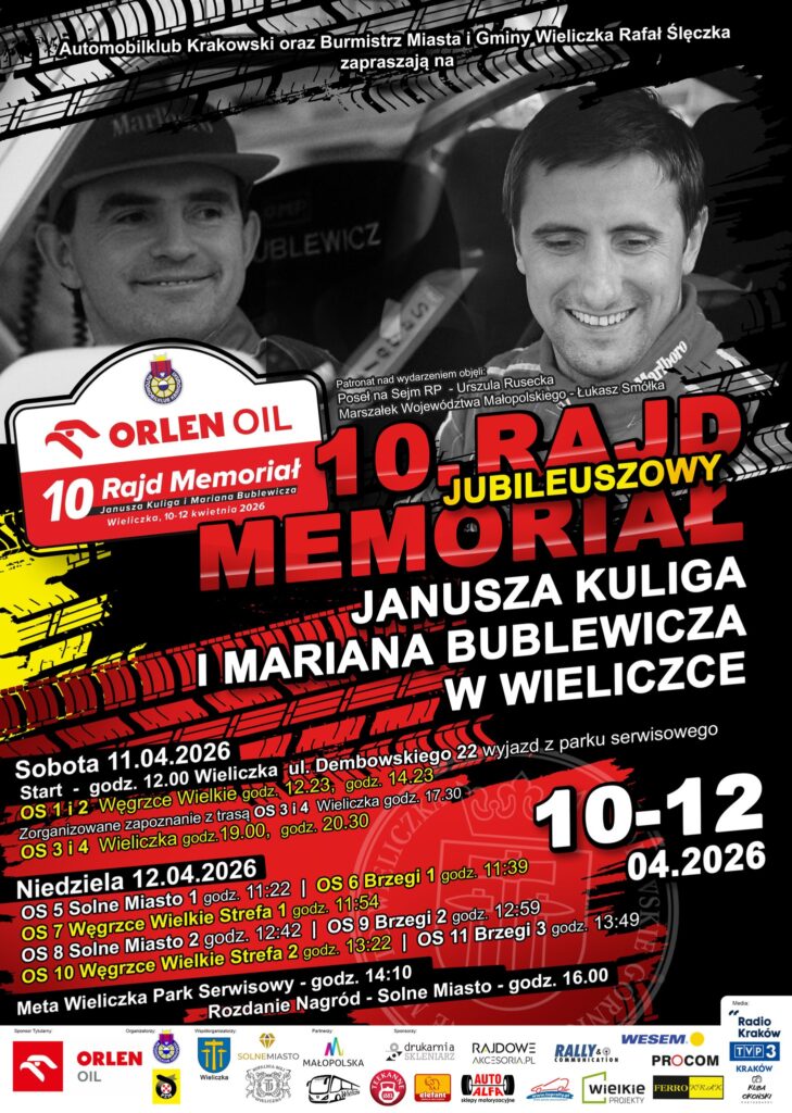 Przygotujcie się na trzy dni pełne prędkości, pasji i emocji: 🏎️ Odcinki specjalne pojawią się m.in. w Węgrzcach Wielkich, Brzegach i w samym sercu Wieliczki – szykujcie się na widowiskową rywalizację! 🔧 Park serwisowy przy tężni solankowej stanie się epicentrum rajdu – zobaczcie zespoły w akcji i zajrzyjcie za kulisy! 🚩 Start rajdu w sobotę o godz. 12:00 z ul. Dembowskiego – pierwsze emocje w Węgrzcach Wielkich, a wieczorem… 🌙 Nocny przejazd ulicami miasta rozgrzeje atmosferę do czerwoności! ⏱️ Niedziela to finałowa walka o każdą sekundę i ostatnie, decydujące odcinki! 🏆 Całość zakończy się uroczystym wręczeniem nagród w Solnym Mieście w Wieliczce o godz. 16:00.